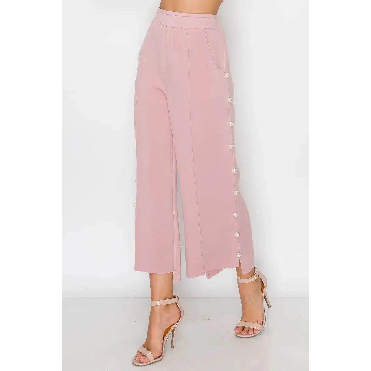 Our Farrah pearl pant. Made beautifully with high quality neoprene french terry. Drapes beautifully. Slightly flared. Pearls going down the sides. Very chic and stylish. Pair this pant with the matching Francine pearl hoodie.The perfect elevated look. Perfect for all seasons.