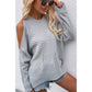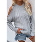 Cable cold shoulder knitted sweater top. Soft cable knitted fabric shapes this top with a ribbed crew neckline, long sleeves with cold shoulders and a loose fit bodice with ribbed hem.