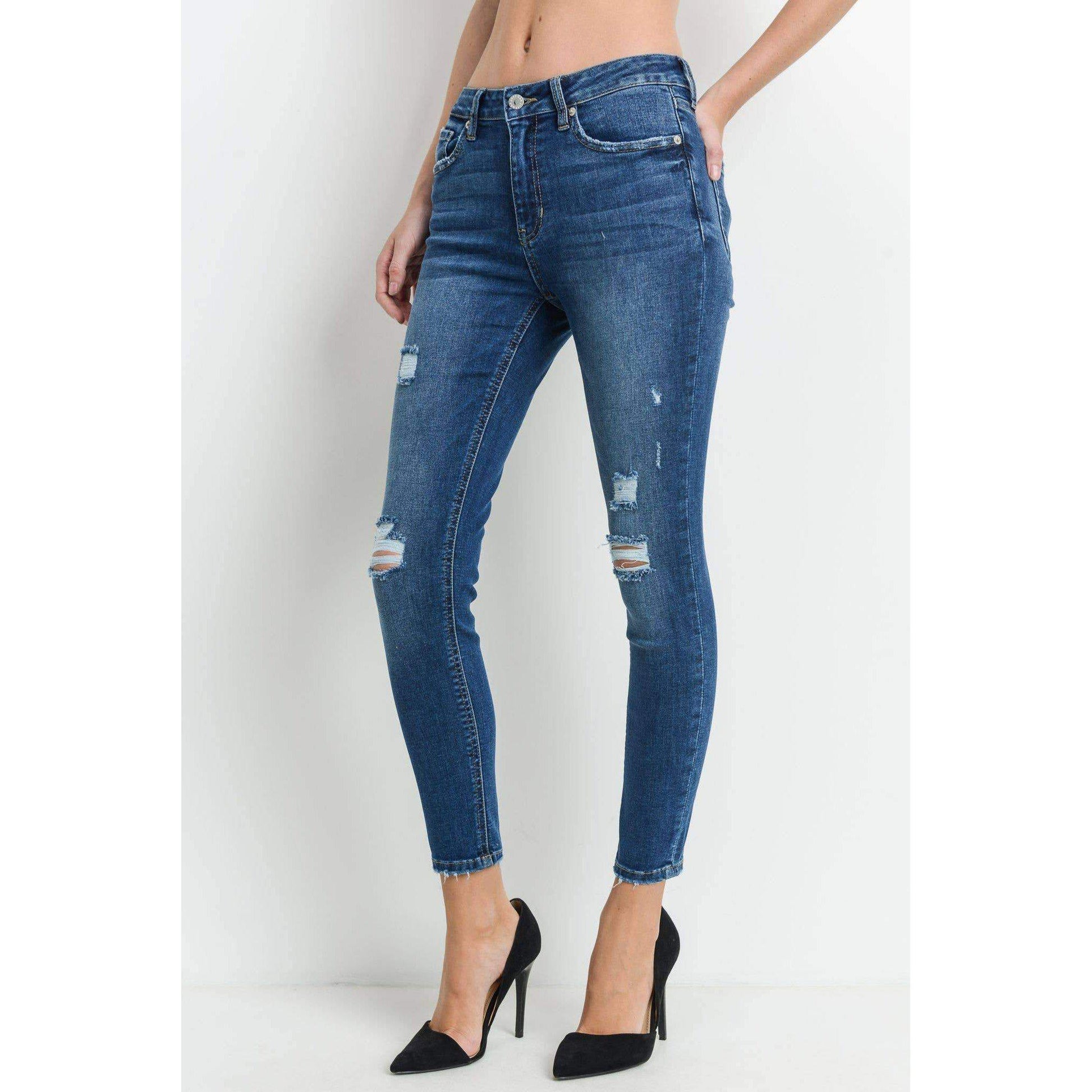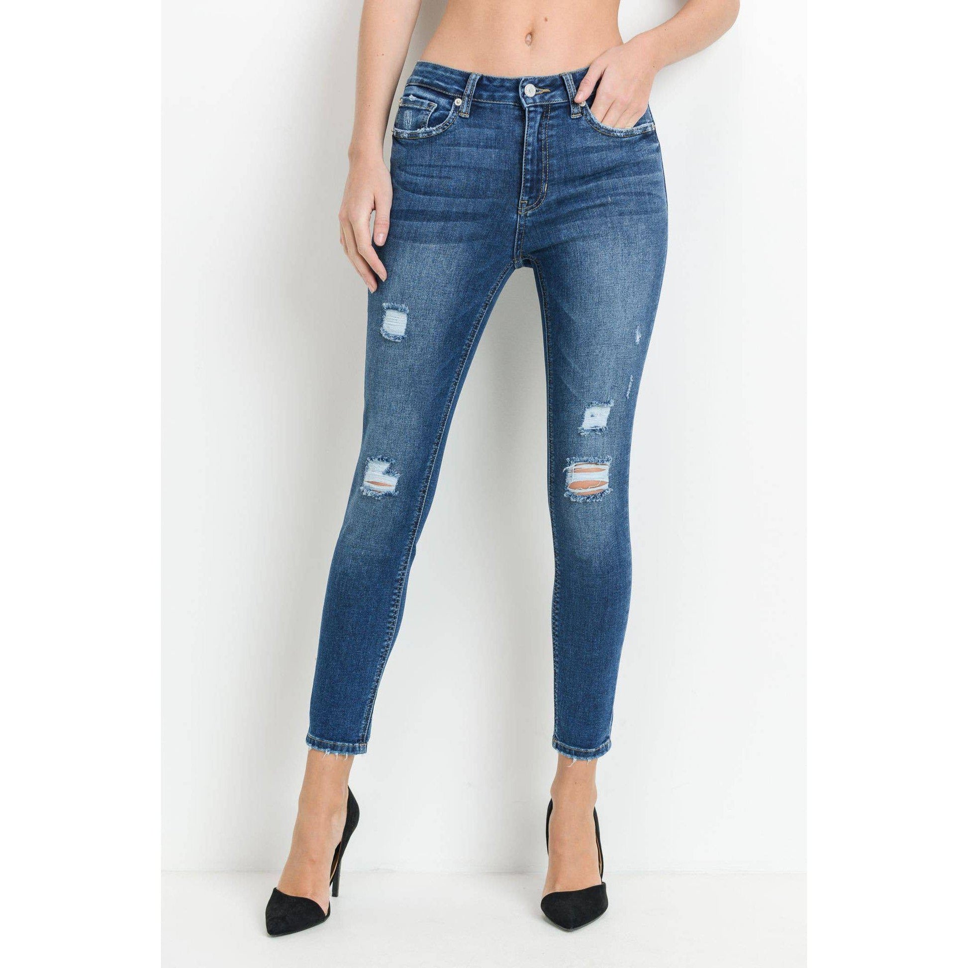 Medium wash, destroyed ankle skinny denim. Pair with any t-shirt, blouse, pullover, etc! These do fit true to size with some stretch.
