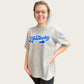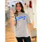 Light bleached grey tee with blue kentucky writing. This is a short sleeve crew neck tee with a spot wash detail.