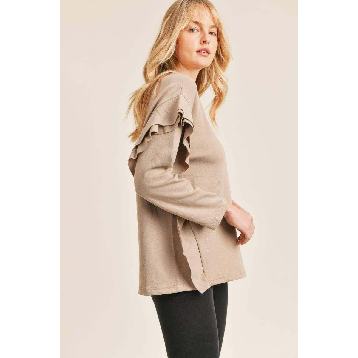 Perfect top to dress up or keep it casual! Pair with any denim or leggings too. Ruffle detail on the sleeves and down the side of the top.