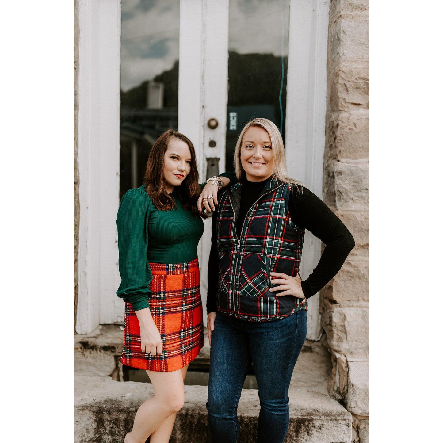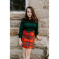 Fully lined woven skirt with side zipper and custom red plaid pattern. Measures approximately 16 1/2" from waist to hem on size small. Model is wearing a size small.