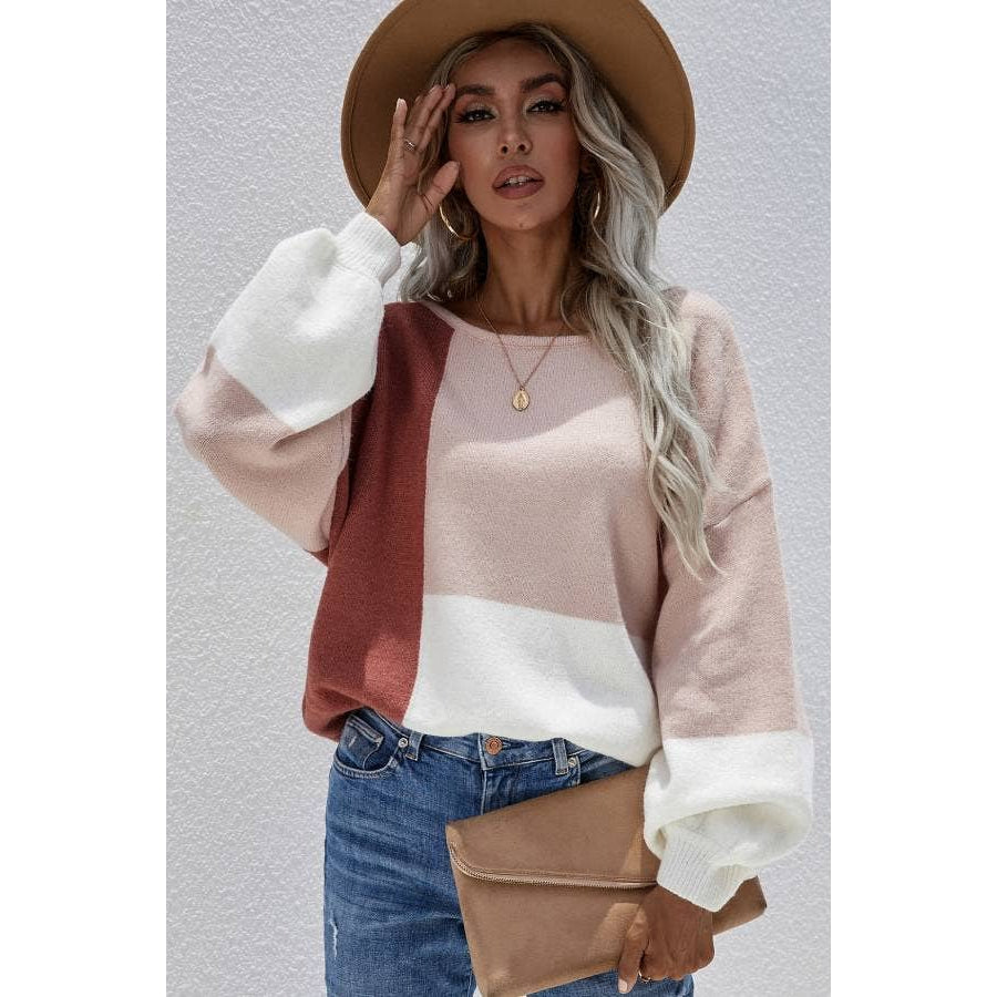 Soft and medium -weight knit shapes this multi color block sweater a wide round neckline, drop shoulders, and long balloon sleeves with fitted cuffs.