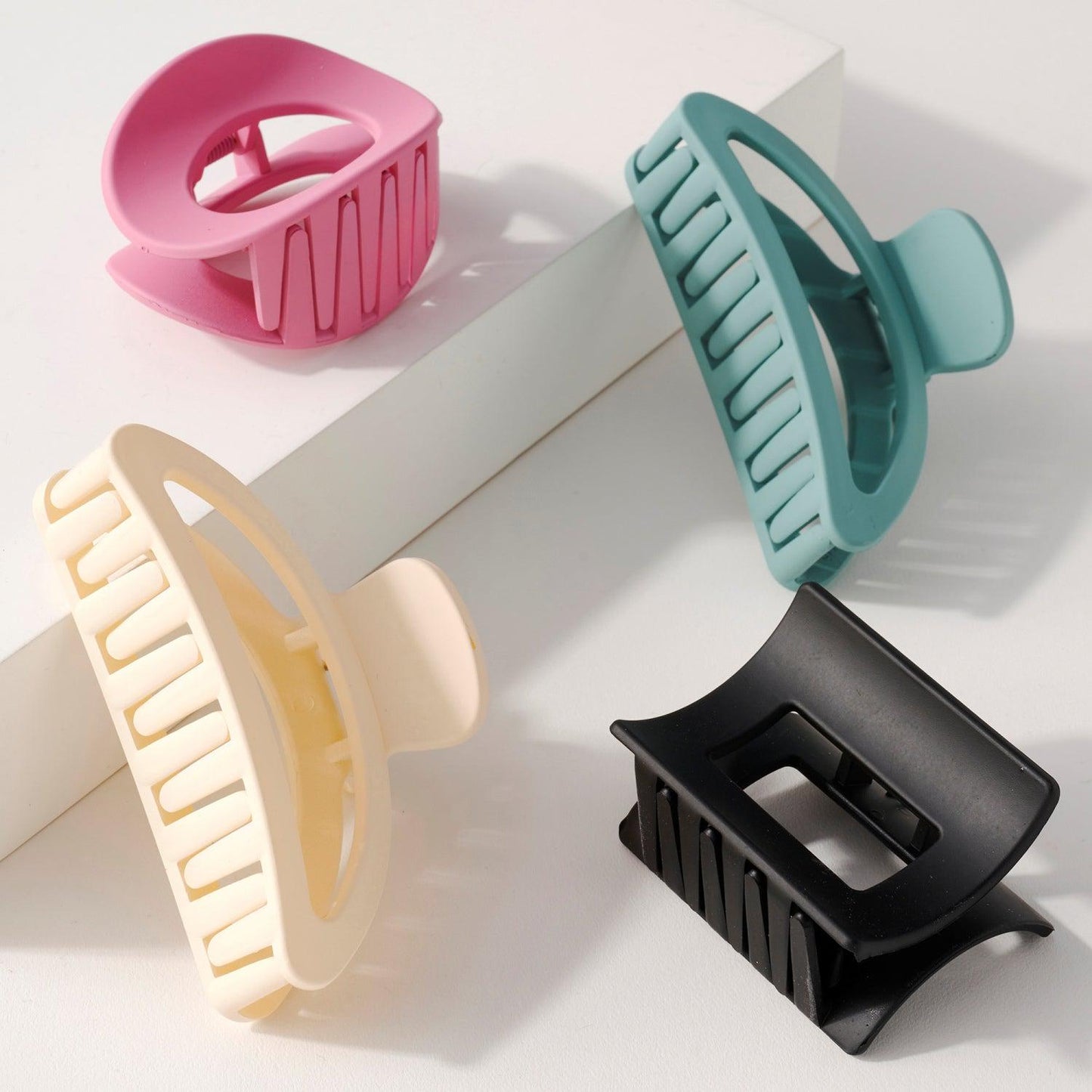Set of 4 mixed shapes of matte hair claws. Consists of rectangle, oval, and curved shapes.