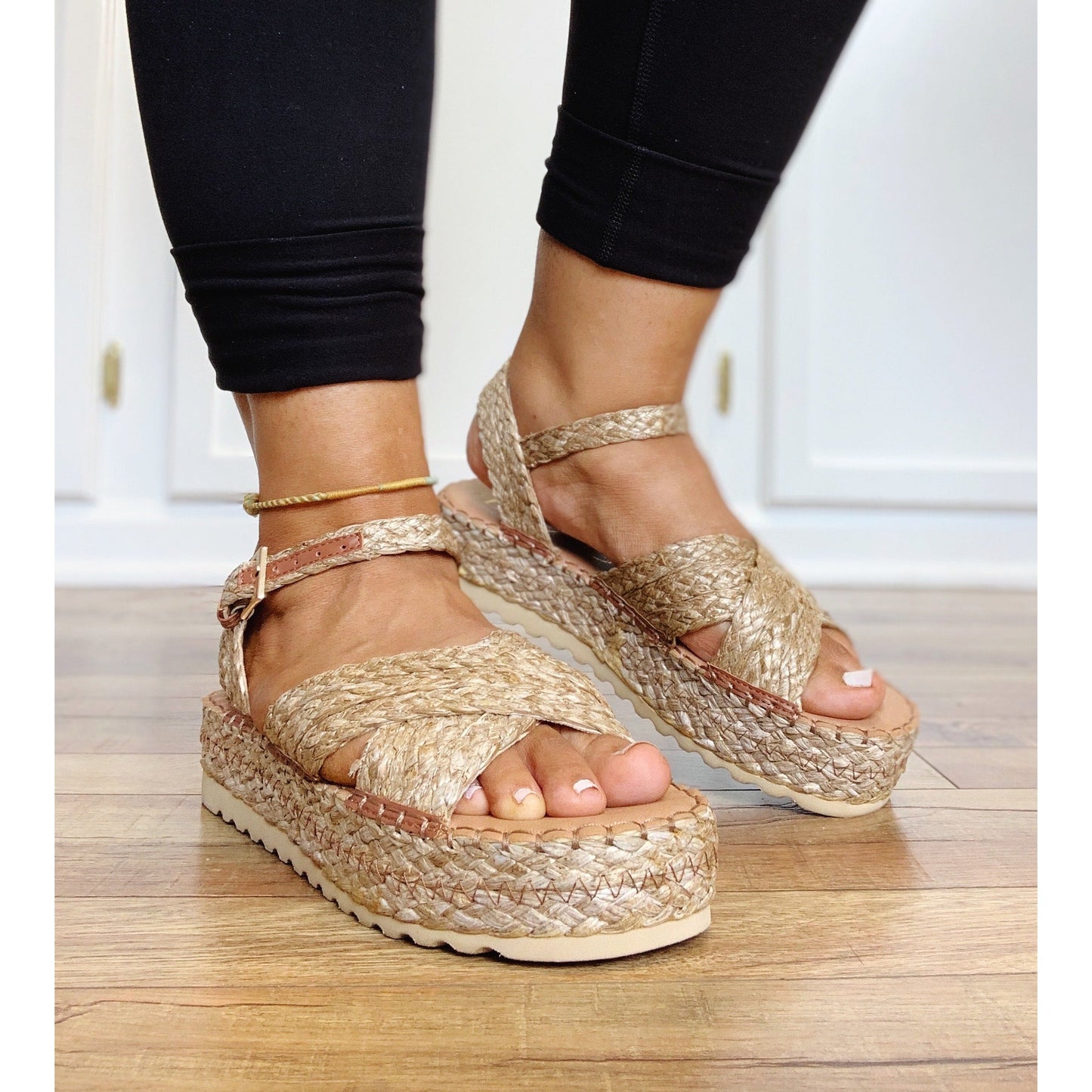 Woven raffia platform.