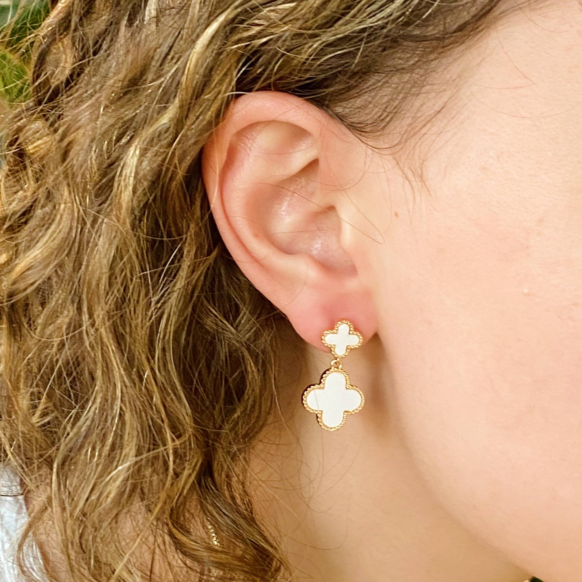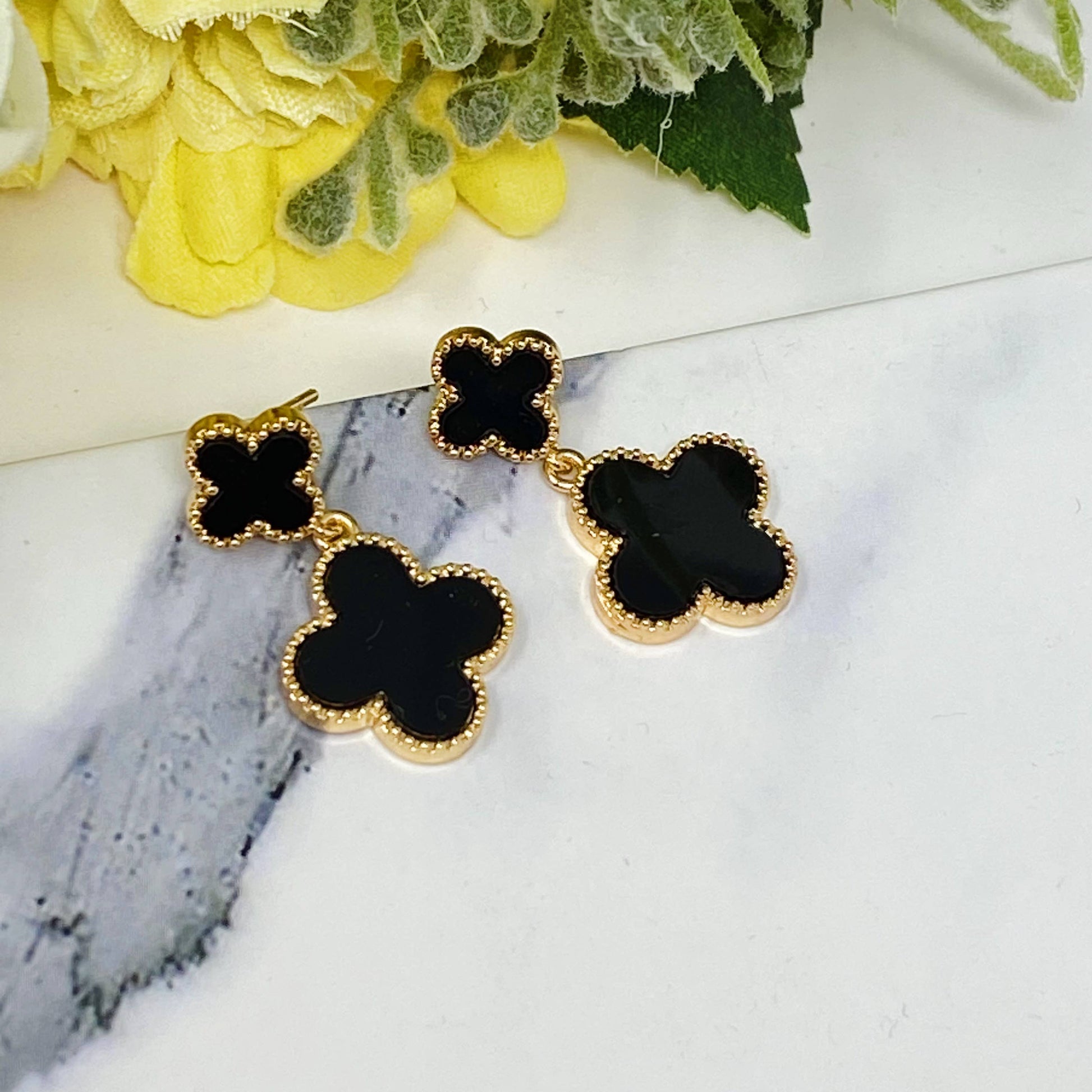 Double tier clover earrings in different fun colors. Has great details in person with shiny colored acrylic finish that is covered with clear film for protection. Scratch and pull to take off the film and the earrings will shine and be prettier!