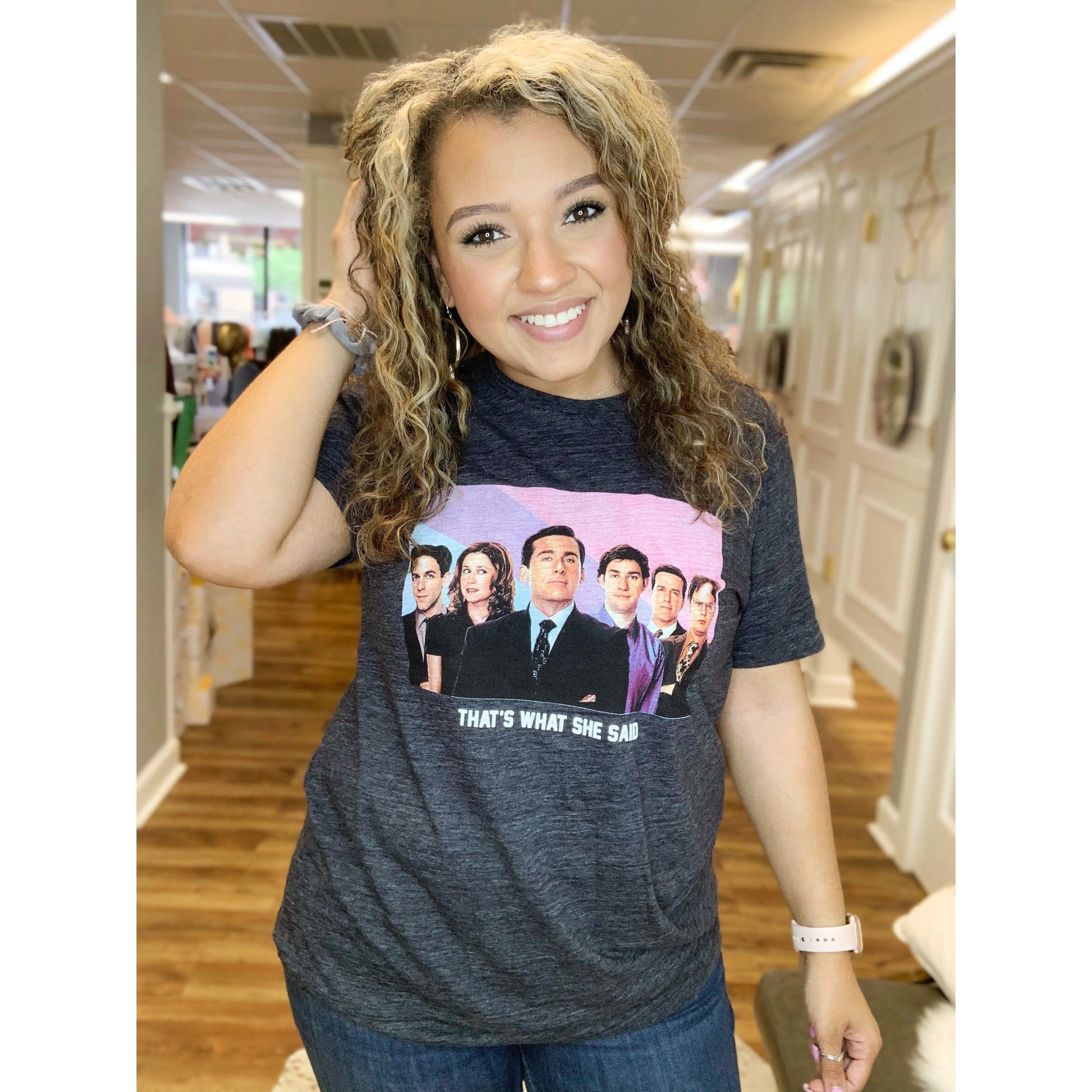 Obsessed? a BIG problem that isn't bad to have.. (that's what she said). This crew is back and you can't resist this speckled pic tee with your favorites on it! A little Jim and Pam with A LOT of Michael Scott is just what your binge watching needs, need!