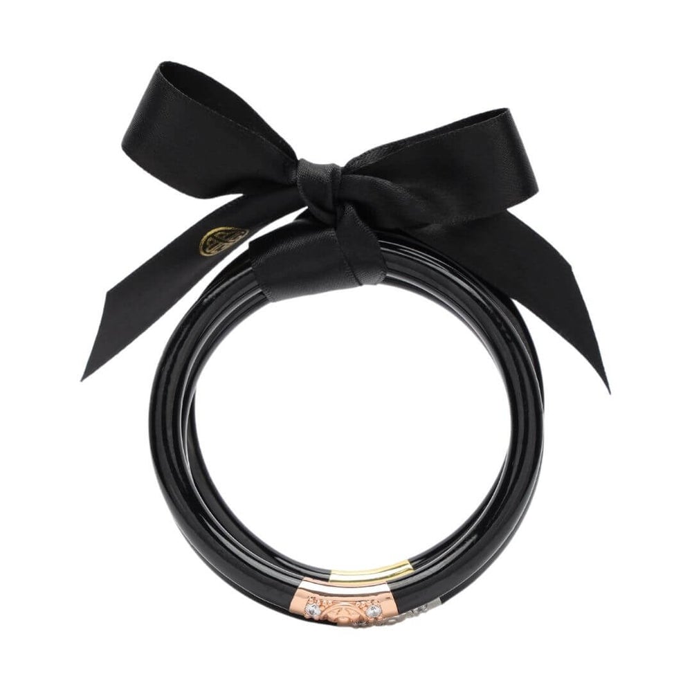 BuDhaGirl’s Three Kings All Weather Bangles® (AWB®) - Black are beautiful orbs that hold all of our extraordinary qualities…they are weightless, soundless, waterproof, and TSA proof while being amazingly glamorous. Available in a set of 3 each in either black or ivory they look stunning combined with our gold or silver All Weather Bangles. Each set has our exclusive Lotus prayer bead in yellow gold, white gold, and rose gold…thus the name Three Kings, paying tribute to the three hues of gold. Three Kings All Weather Bangles® (AWB®) - Black are beautifully packaged for you in our custom BuDhaGirl Silk All Weather Bangles box, included with your purchase.